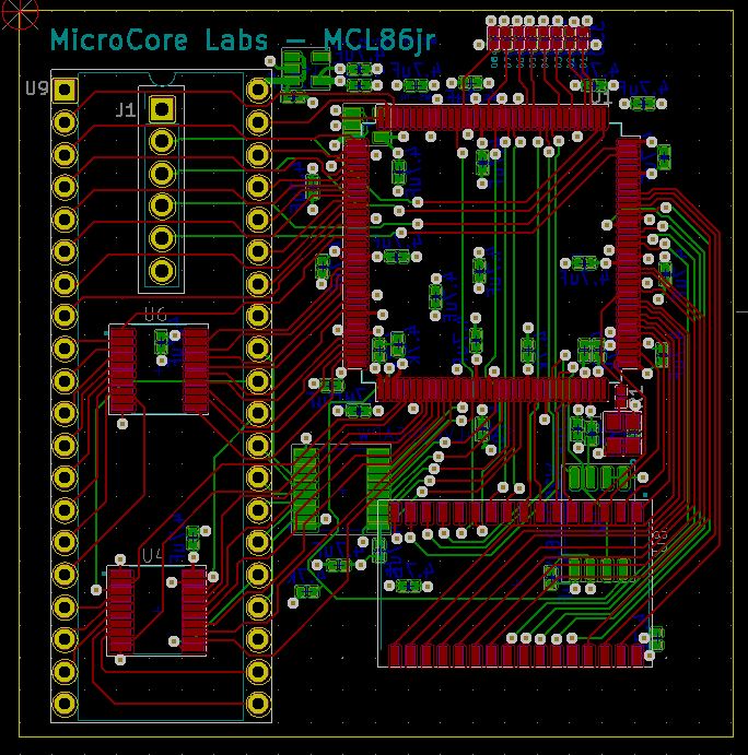 I just finished the layout for the MCL86jr, which is a small board which can replace the 8088 CPU in the IBM PCjr. It uses my MCL86 CPU core with a “minimum” mode BIU (Bus Interface Unit) and is implemented in a Xilinx Spartan-6 FPGA. The board contains a 512KB Static RAM which can bring the PCjr’s total RAM to 640KB or can be used to mirror and accelerate the BIOS ROM or even load PCJr cartridge images!
