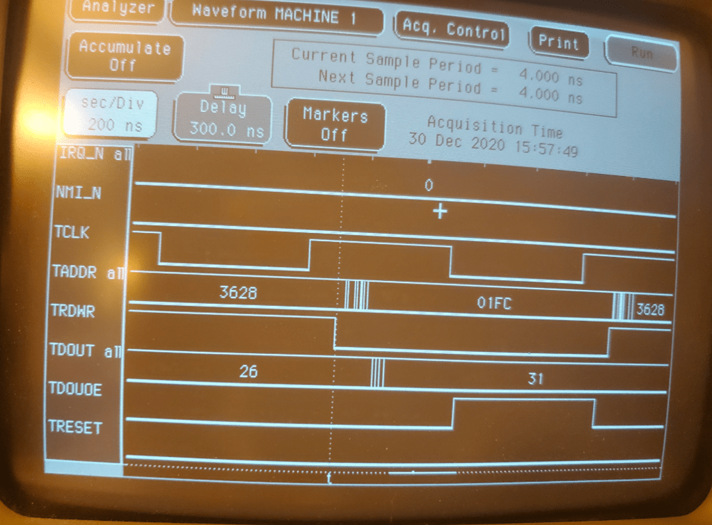 I used a logic analyzer to observe the 6502 bus timing that I able to achieve and it appears to have under 300ns clock to out for the address bus which is within spec. It is difficult to implement parallel GPIO input and outputs with the Teensy 4.1, so I decided to use parallel inputs for the received data[7:0] and sequential writes for each bit of the address bus. I will try to perform parallel writes to GPIO6 directly, but I believe there could be issues with unwanted bits being updated…