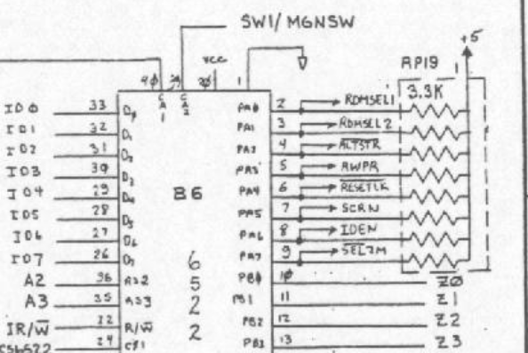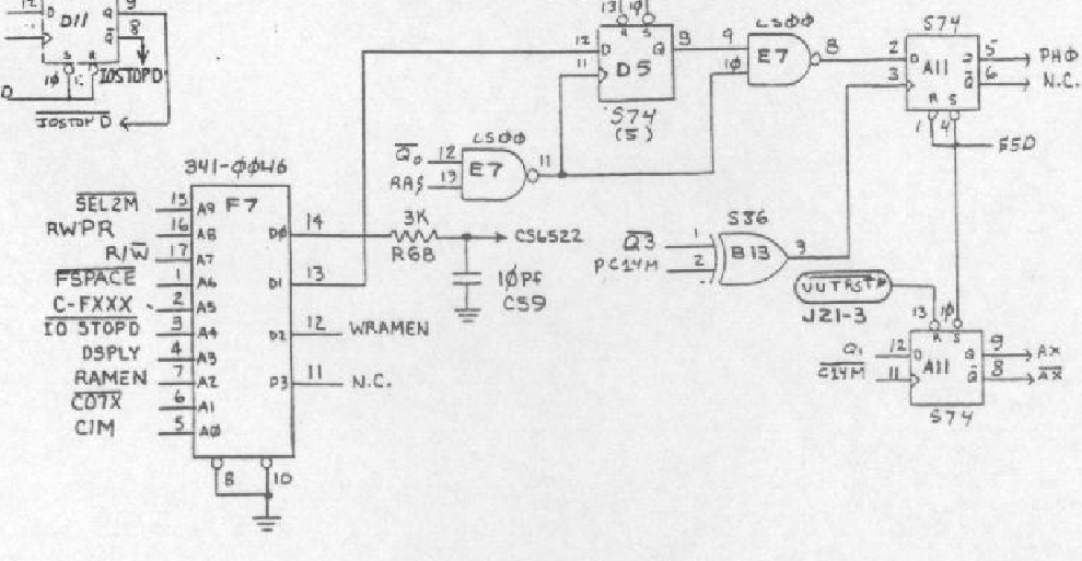 It is my understanding that the Apple III will operate at a clock speed of 2 Mhz when accessing some address ranges and 1 Mhz for others, so I worry that my 680 ohm pulldown solution may not work at the faster clock speed. I looked over the schematic for a way to force the motherboard to run full-time at 1 Mhz.