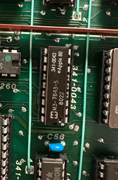 Starting at the ROM, I traced the net back through every IC in the path, back to the source which ended up being an Apple PLD. It appeared to have a bad output driver which could drive to a logic ‘1’ but not to a ‘0’.